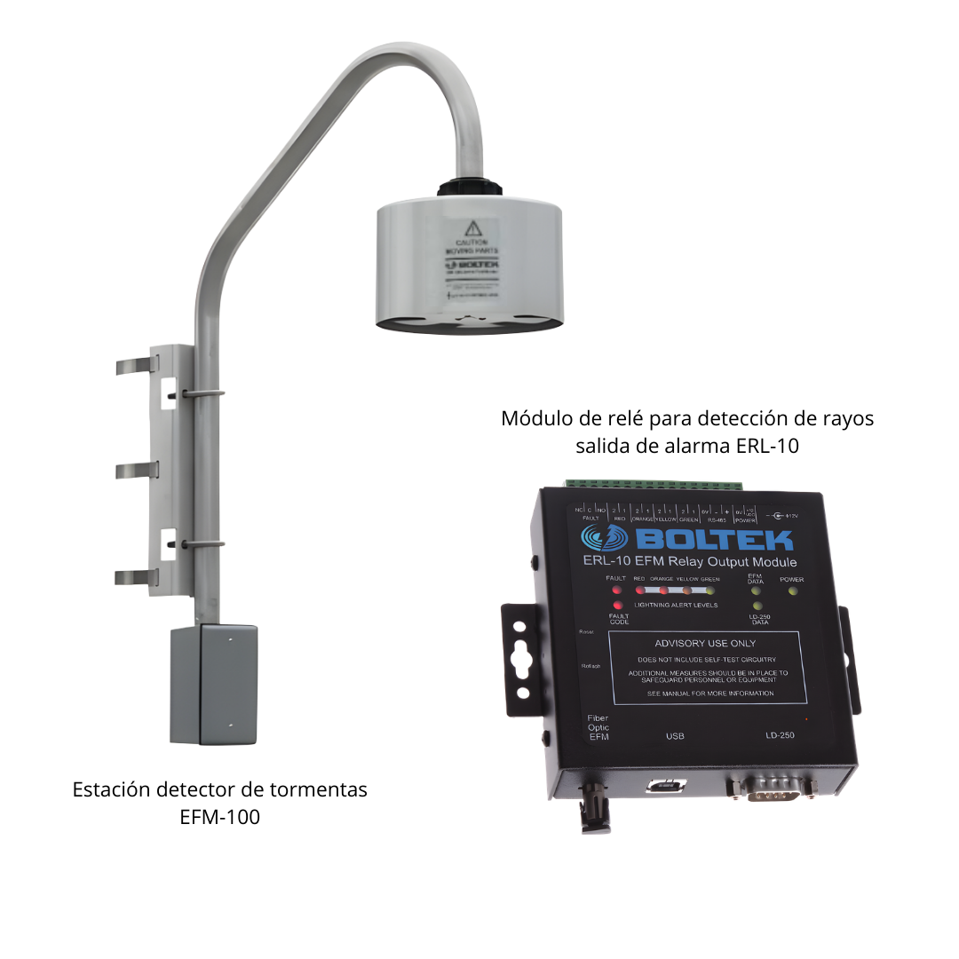 Esta estación combina el sensor de campo eléctrico EFM-100 con el módulo de relés ERL-10 para ofrecer un sistema completo de detección preventiva. A diferencia de los detectores de rayos convencionales, esta solución permite identificar condiciones de rayo inminente antes de que se produzca la primera descarga, permitiendo una toma de decisiones anticipada.