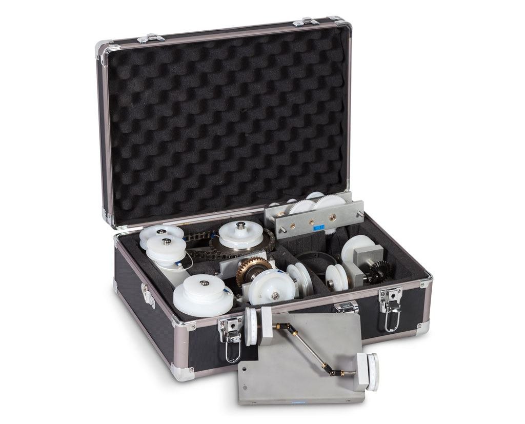 - Conjunto de engranajes (dos ejes paralelos). Comparación de las relaciones de velocidad de un conjunto de engranajes de fase única y de dos fases. Medición de los trabajos mecánicos correspondientes y las eficacias con cargas diferentes.