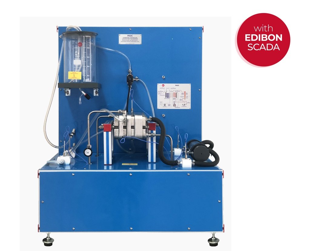Pasteurizador de Laboratorio «PASC». Simula la pasteurización en un proceso continuo a pequeña escala, permitiendo a los estudiantes aprender sobre técnicas de conservación de alimentos en condiciones controladas.