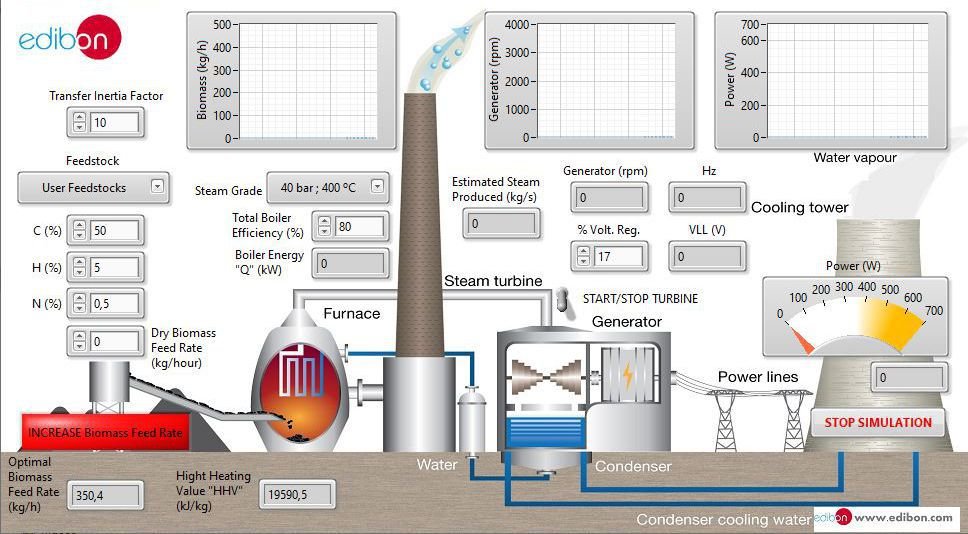 Simulador de Planta de Biomasa «PSV-BPP-SOF». Aprende sobre la generación de energía a partir de biomasa y el ciclo Rankine, comprendiendo cómo estos sistemas contribuyen a la sostenibilidad energética.