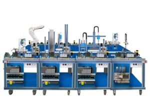 Sistema de Fabricación Flexible 1 «AE-PLC-FMS1». Explora un sistema modular de fabricación flexible que simula una línea de producción automatizada con múltiples estaciones de trabajo interconectadas.