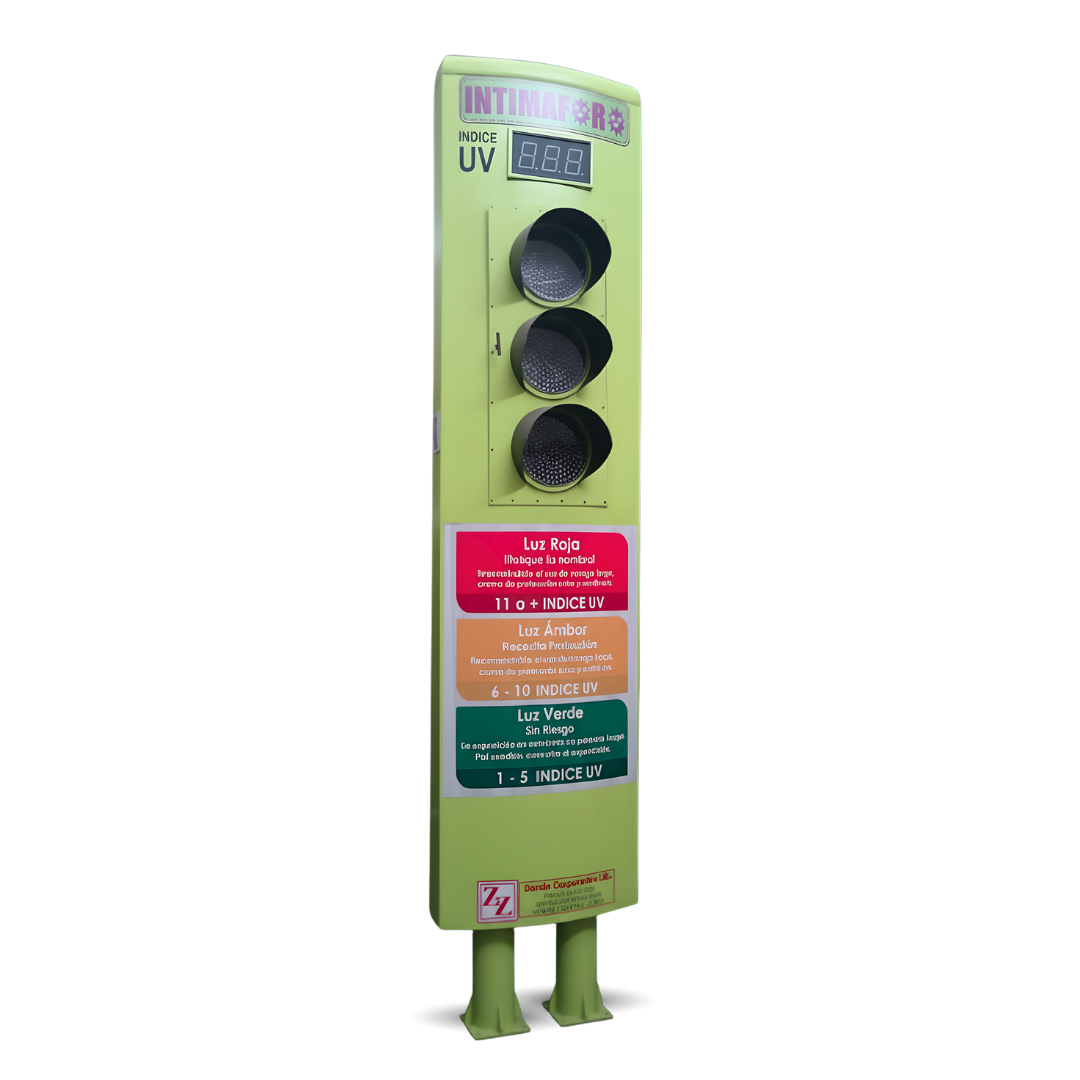 El Visualizador urbano de radiación ultravioleta (Intimáforo) es un semáforo de radiación UV diseñado para espacios públicos que permite visualizar el índice UV en tiempo real, traduciendo datos técnicos en un mensaje visual claro, educativo y preventivo para la población.